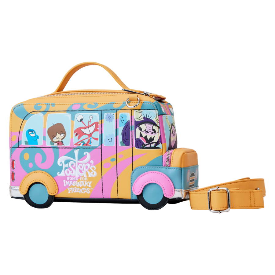 Climb aboard the Loungefly Foster's Home for Imaginary Friends Figural Bus Crossbody Bag for an outing with your favorite make-believe pals. Eduardo sets the course as he drives the home's colorful commuter bus, which runs on moveable wheels that set things in motion. Turn the bag around to see some of Foster's most beloved residents wave from the windows! Zippered pockets at the top and front of the bus help to keep your belongings safe at hand. Perfect for anyone looking to adopt a new look, this accessory makes a loyal travel companion for any adventure.
